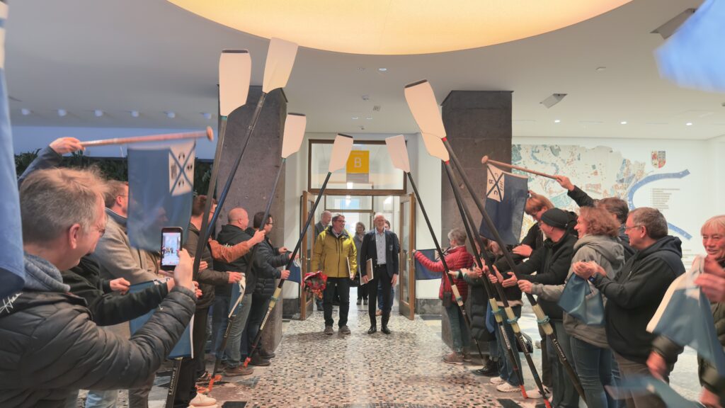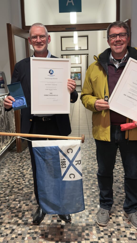 Am 29.20.2026 wurden zwei unserer fleißigsten Vereinsmitglieder vom Stadtsportbund mit dem Ehrenamtpreis ausgezeichnet. Philipp te Neues (Finanzvorstand) und Christian Noell (Bootsward) des Crefelder Ruder-Clubs. Seit vielen Jahren sind die beiden für den CRC aber auch darüber hinaus (u.a. Regattaverein Niederrhein) ehrenamtlich tätig. Ohne Christian wäre schon so manch ein Boot auf Grund gelaufen, während Philipp die Finanzen des Clubs treuhänderisch und zuverlässig verwaltet. Selbstverständlich wurden die beiden nicht allein ins Krefelder Rathaus geschickt. Viele Club-Mitglieder hatten sich zur Überraschung der beiden im Foyer versammelt und standen, mit Skulls und Fahnen bewaffnet, Spalier. Und wie es sich für eine eingeschworene Gemeinschaft gehört, ging es danach noch zur Brauerei Gleumes, um gemeinsam zu feiern.